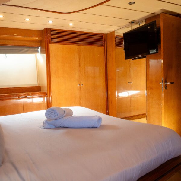 Step into a warm and elegant salon with wood finishes and upholstery, perfect for unwinding after a day at sea. With four ensuite cabins, it can accommodate up to eight guests overnight, offering great comfort and privacy.
